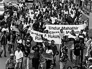 ![]() Street protests in Kuala Lumpur after Anwar Ibrahim's sentencing, April 1999. | |||