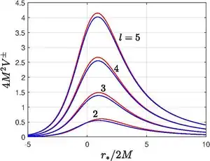 where and characterizes the eigenmode for the coordinate. For gravitational perturbations, the modes are irrelevant because they do not evolve with time. Physically gravitational perturbations with (monopole) mode represents a change in the black hole mass, whereas the (dipole) mode corresponds to a shift in the location and value of the black hole's angular momentum. The shape of above potentials are exhibited in the figure.
