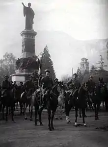 At the outbreak of World War I the regiment consisted of a command, the regimental depot, and two cavalry groups, with the I Group consisting of three squadrons and the II Group consisting of two squadrons and a machine gun section. In 1917 the regimental depot in Lucca formed the 855th Dismounted Machine Gunners Company as reinforcement for infantry units on the front.[3] In 1916 the regiment distinguished itself in the Sixth Battle of the Izono. After the Italian defeat in the Battle of Caporetto the regiment covered the retreat of the IV Army Corps to the Piave river and fought delaying actions at Idrsko, Caporetto, Stupizza, Sequals, Marano, and Zugliano. The regiment lost half its men before crossing the Piave river to safety.[1]