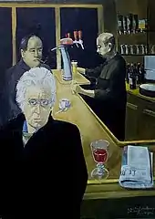 Gray had a studio on Leeson Street in the early 1950s. There he made a wash drawing of the artist Patrick Swift which he used as a base for a large canvas homage to the painter some years later.[6] Gray's first paid work was a commission by University College Dublin to design the setting and costumes for their production of The King's Threshold by W.B. Yeats. The lead in the play was given to the young actor-poet John Jordan. During the preparations and rehearsals Gray painted a portrait of Jordan which now hangs in the collection of The Dublin Writers Museum. At this point the artist Cecil Ffrench Salkeld ARHA (Associate of the Royal Hibernian Academy) took an interest in Gray, and gave him a room in his Dublin home where Gray studied old master techniques. Salkeld was visited by writers, painters and musicians, such as Brian O'Nolan, Arland Ussher, Francis Stuart, Marten Cumberland and John Beckett, cousin of Samuel. Gray painted John Beckett during this period and the portrait now hangs in St. Columba's College, Dublin, where Beckett had his first music lessons. Gray became a close friend of Brendan Behan and was asked to be best man at Behan's wedding.[2][7] Gray designed many settings for The Pike Theatre[8] including the production of The Rose Tattoo[9] by Tennessee Williams. After the success in Dublin, the play was transferred to The Grand Opera House, Belfast and Gray travelled there to redesign and create the much larger settings need for the bigger stage. Look Back in Anger by John Osborne was at the same time running at the Opera House and Gray befriended and sketched the leading actress Jocelyn Britton. Later he designed the sets for Nekrassov[10] by Jean-Paul Sartre which was mounted at The Gate Theatre. Gray later went on a tour of Ireland with The Dublin Repertory Theatre Company designing their productions, including The Wood of the Whispering by M. J. Molloy.