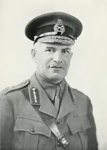 The division remained in reserve until April 1918, when German forces attacked as part of the Spring Offensive. During the Battle of the Lys, the Portuguese Expeditionary Corps was effectively wiped out, leaving a two-mile wide gap in the British lines. The 33rd was ordered into position, and Pinney personally commanded the divisional machine-gun battalion, which—with the assistance of various stragglers from retreating units—helped turn back a heavy German attack at the Battle of Hazebrouck on 12 and 13 April.[1] For his service in April, Pinney, along with the commanders of the 12th, 55th and 61st Divisions, was appointed a Knight Commander of the Order of the Bath.[43] The 33rd was used to train the U.S. 30th Division through the summer,[31] but went over to the offensive in September, seeing action at the Battle of the St Quentin Canal, the Battle of Cambrai, and the Battle of the Selle.[33] At the Selle, Pinney organised a dawn attack with improvised bridges, allowing the 33rd to force a bridgehead and successfully clear the opposing bank in a short time.[31] The division finished the war in the Sambre valley, and began demobilisation.[33] In February 1919, with the division mostly demobilised, Pinney retired from the army, aged fifty-five, after thirty-five years service.[1]