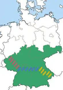 The Reihengräber culture, which developed within north-eastern Gaul under Romano-Germanic settlement during the fifth century, was located primarily between the Rhine and the Loire in the fifth century. It spread to the Germanic regions of Thuringia and Bavaria in the sixth century.[5] Scholars have divided the Reihengräber culture into an eastern "Thuringian and Langobard" zone and a western "Bavarian and Alamanni" zone, based on the similar burial customs and material culture shared between these ethnic groups. Frankish populations were also present within these zones. Most Reihengräber sites in Germany are found on the River Danube or the River Main, with pockets of Frankish dominated settlements on the River Rhine. The eastern zone of the Reihengräber culture lies within the Thuringian Forest south of the Harz mountains, and extends eastward towards the River Elbe, where Slavic cultures settled on the eastern bank. The western Bavarian zone lies between the River Lech and River Enns. Both zones remained autonomous of Merovingian control until the mid-6th century, when Garibald I of Bavaria was installed as Duke in 555 A.D.[6]