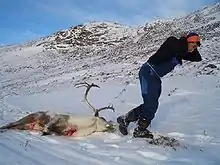 Carrying a reindeer over a long distance in rugged mountainous terrain can be difficult and very strenuous. More than five kilometers each way is not uncommon.[27] If the animal is very large, it may only be possible to transport one half at a time. In Greenland, reindeer meat is commonly carried over the shoulders,[53] possibly tied to a backpack frame, or carried on the back with support from a headband, the last being a method preferred by the Inuit. Unskinned game may also be dragged on snow, or allowed to slide down steep, snow-covered hillsides, thus saving much work and freeing the hands for support while climbing downhill.