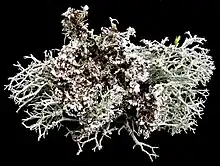 Thalli are fruticose, and extensively branched, with each branch usually dividing into three or four (sometimes two); the thicker branches are typically 1–1.5 millimetres (132116 inch) in diameter.[3] The color is grayish, whitish or brownish gray. C. rangiferina forms extensive mats up to 10 centimetres (4 in) tall. The branching is at a smaller angle than that of Cladonia portentosa.[4] It lacks a well-defined cortex (a protective layer covering the thallus, analogous to the epidermis in plants), but rather, a loose layer of hyphae cover the photobionts. The photobiont associated with the reindeer lichen is Trebouxia irregularis.[5] It grows on humus, or on soil over rock. It is mainly found in the taiga and the tundra.