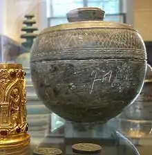 The stupa was excavated in 1908–1909 by a British archaeological mission; where the Kanishka casket was discovered with three small fragments of bone.[88] Three pieces of bone (approx 1½ in. or 3.8 cm long) were found in a crystal reliquary in a bronze casket bearing an effigy of Kanishka and an inscription recording his gift.[89][90] They were removed to Mandalay in 1910 by Gilbert Elliot-Murray-Kynynmound, 4th Earl of Minto, the Governor-General of India, for safekeeping.[91] They were originally kept in a stupa in Mandalay but it has become dilapidated and is used as housing. The relics are being kept in a nearby monastery until funds can be found to build a new stupa to house the relics next to Mandalay Hill. The crystal reliquary holding the bones is now enclosed in a gold and ruby casket provided by Burmese devotees.