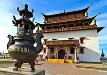 Buddhism in Mongolia began with the Yuan dynasty (1271-1368) emperors' conversion to Tibetan Buddhism. The Mongols returned to indigenous shamanic traditions after the collapse of the Mongol Empire, but Buddhism reemerged in the sixteenth and seventeenth centuries. During the communist Mongolian People's Republic (1924–1992), Buddhism was suppressed with an estimated 17,000 monks being killed under the regime, official figures show.[3] After the collapse of communism in the 1990s, there has been a resurgence of Buddhism in the country, both within the fold of the traditional monastic institution and through the spread of New Age-inspired and monotheism-inspired new religious movements of Buddhism.[4] According to the 2020 census of Mongolia, 51.7% of the population, that is 1,704,480 people, are adherents of Buddhism.[1]