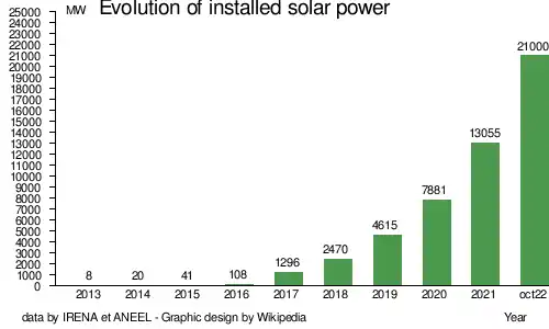 In October 2022 Brazil reached 22 GW of installed solar power.[20][21] In 2021, Brazil was the 14th country in the world in terms of installed solar power (13 GW),[22] and the 11th largest producer of solar energy in the world (16.8 TWh).[16] The total installed solar power in Brazil was estimated at about 34.2 GW at October 2023, which consists of about 15.6% of the country's electricity matrix.[23] In 2022, Brazil was the 8th country in the world in terms of installed solar power capacity (24.079 GW).[24]