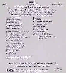 "Reno" is a song co-written and recorded by American country music artist Doug Supernaw. It was released in May 1993 as the second single from his album Red and Rio Grande. It peaked at number 4 in the United States,[1] and number 12 in Canada. It was his first top five hit, as well as his first top ten hit.