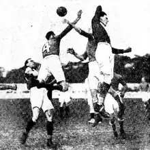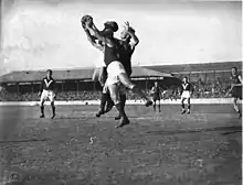 ![]() Players contest a mark at the Australian Football Carnival, in 1933, at the Sydney Cricket Ground. The teams are New South Wales and Western Australia. | |
