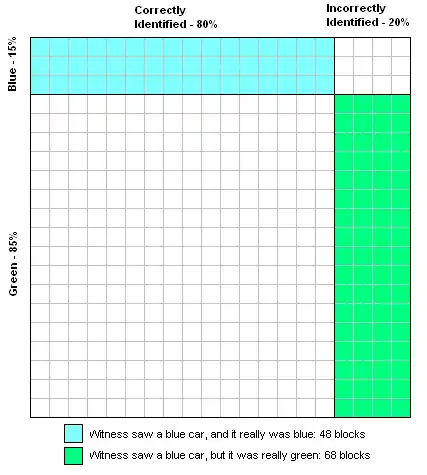 • There is a 17% probability (0.17 = 0.85 × 0.20) that the green cab is (incorrectly) identified by the witness as blue.