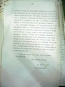 Reports were also coming into Palestine about the German atrocities during the autumn of 1942.[23] The allies received a detailed eyewitness account from Polish resistance fighter and later Georgetown University professor, Jan Karski. On 10 December 1942, the Polish government-in-exile published a 16-page report addressed to the Allied governments, titled The Mass Extermination of Jews in German Occupied Poland.[lower-alpha 5]