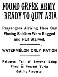 - 1 2 3 Dobkin, Marjorie Housepian, Smyrna 1922: The Destruction of a City; New York, Harcourt, Brace, Jovanovich, 1971; p. 71.