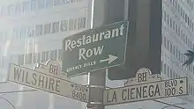 La Cienega in Beverly Hills, north of Wilshire Boulevard, is known as Restaurant Row because it features many upscale restaurants. From Wilshire in Beverly Hills traveling north the best known establishments include Benihana, The Stinking Rose, Darioush, the original Lawry's the Prime Rib, Hakobe, Tokyo Table - Tokyo City Cuisine, Matsuhisa, Fogo de Chão, Gyu-Kaku, Woo Lae Oak, The Bazaar by José Andrés, and Morton's.[2]