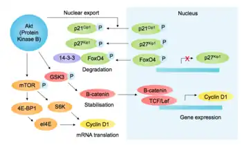 p85, another SH2-domain-containing protein, binds activated RTKs and recruits PI3K (phosphoinositide-3-kinase), phosphorylating the phospholipid PIP2 to PIP3, leading to recruitment of Akt (via its PH-domain). In addition to other pro-growth and pro-survival functions, Akt inhibits glycogen synthase kinase-3β (GSK3β), thereby preventing GSK3β -mediated phosphorylation and subsequent degradation of cyclin D1[10] (see figure[11]). Akt further regulates G1/S components by mTOR-mediated promotion of cyclin D1 translation,[12] phosphorylation of the Cdk inhibitors p27kip1 (preventing its nuclear import) and p21Cip1 (decreasing stability), and inactivating phosphorylation of the transcription factor FOXO4 (which regulates p27 expression).[13] Together, this stabilization of cyclin D1 and destabilization of Cdk inhibitors favors G1 and G1/S-Cdk activity.