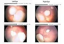 - ↑ Shields CL, Mashayekhi A, Cater J, Shelil A, Ness S, Meadows AT, Shields JA (June 2005). "Macular retinoblastoma managed with chemoreduction: analysis of tumor control with or without adjuvant thermotherapy in 68 tumors". Archives of Ophthalmology. 123 (6): 765–773. doi:10.1001/archopht.123.6.765. PMID 15955977.