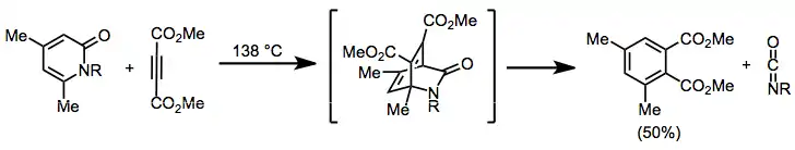 Release of isocyanates from Diels–Alder adducts of pyridones can be used to generate highly substituted aromatic compounds. The isocyanates may be isolated or trapped if they are the desired product.[14]