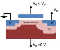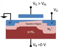 In the figures, the source (left side) and drain (right side) are labeled n+ to indicate heavily doped (blue) n-regions. The depletion layer dopant is labeled NA− to indicate that the ions in the (pink) depletion layer are negatively charged and there are very few holes. In the (red) bulk the number of holes p = NA making the bulk charge neutral.