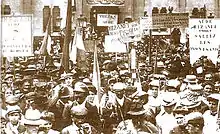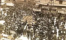 On 12 May 1907 these were 150,000 demonstrators at the Béziers rally in the de the Allées Paul Riquet and the Champ-de-Mars. Slogans on the banners read in French or Occitan, "Victory or death!"; "Enough of speech, deeds"; "Death to fraudsters"; "Bread or death"; "Live working or die fighting"; "To have so much good wine and not be able to eat bread!".[29][25] The demonstrators, who came from more than 200 communes, were joined by many employees and traders from Béziers. The event was closed by speeches on the Place de la Citadelle. Jean-Jaurès spoke and then Marcelin Albert launched an ultimatum to the government asking it to raise the price of wine. Ernest Ferroul set this ultimatum to expire on 10 June and advocated a tax strike, "If by June 10, the government has not found a solution to the crisis then there will be resignation of the town halls of the South! There will be a tax strike!".[32] Emile Suchon, Mayor of Béziers and close to Clemenceau, supported the winemakers' fight. There were some slight incidents between the appeal and the dispersal of the demonstrators.[29]
