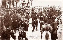 The 17th line infantry regiment was composed of reservists and conscripts from the region. It was transferred from Béziers to Agde on 18 June 1907. When they heard the gunfire on the evening of 20 June about 500 soldiers from the 6th company of the regiment mutinied. They looted the armory and moved back towards Béziers.[29] After a night march of about 20 kilometres (12 mi) they arrived in Béziers early in the morning of 21 June, where they were warmly welcomed. The fraternized with the demonstrators, occupied the Allées Paul Riquet and peacefully opposed the armed forces already in the city. The soldiers then peacefully settled in the Allées Paul Riquet. The population offered them wine and food.[21]