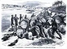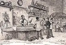 This did not end the manufacture of fake wines. In Le Monde illustré of 12 March 1870 an article by Leo de Bernard denounced falsified wine, "petit bordeaux ... made in Bercy, where the tasting service always has its eye and nose open. The containers of this mixture, made of unknown ingredients, are confiscated and placed in a special cell. Their detention does not last long because there is no doubt of their guilt. On the day of execution, the condemned barrels are brought to the bank of the quai d'Austerlitz. A police commissioner ensures that prompt justice is done. When the signal is given the executioner of the high hygienic works opens the flanks of the victim, and from the deep wound a large black flow escapes into the Seine whose hue vaguely recalls logwood, litharge and other harmful drugs."[7]
