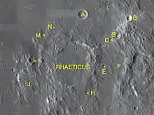 By convention these features are identified on lunar maps by placing the letter on the side of the crater midpoint that is closest to Rhaeticus.[4]