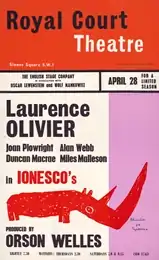 Rhinoceros was a 1960 production of Eugène Ionesco's surrealist play of the same name, which had been written the year before. It was the first English-language production of the play, starred future husband-and-wife team Laurence Olivier and Joan Plowright, and was directed by Orson Welles. Olivier also co-produced the play, which was Welles's last work as a theatre director.