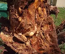 The palmetto weevil (Rhynchophorus cruentatus) is an insect native to Florida, but has been found as far as southern Texas to the west and South Carolina to the north.[1][2] It is the largest weevil in North America and the only kind of palm weevil in the continental United States.[1] It infests palms and is considered a pest.[1][3][4] Its main target is the Canary Island date palm, but date palms (a different species than the Canary Island date palm), sabal palms (the palmetto weevil's traditional target), saw palmetto (the palmetto weevil's traditional alternative target), Washingtonia, Pritchardia, royal palms, Latania, coconut palms, Caryota, and Bismarckia are also susceptible.[1][2][3][5] Distressed palm trees are usually attacked, which makes transplanted trees a frequent target.[3] The Palmetto Weevils mate at the base of the palm branches where the females deposit their eggs.[3] The grubs then eat into the palm tree, killing it.[3] After the larvae have turned into adult weevils, the damage can be seen, but by then, it is considered to be too late for the tree.[1][3] The life cycle from egg to adult for a palmetto weevil is about 84 days.[6] For prevention, it is recommended an appropriate insecticidal crown drench is done twice a year for high value palms.[3]