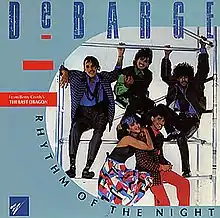 "Rhythm of the Night" is a song by American musical recording group DeBarge, written by Diane Warren and released on February 23, 1985, on the Motown label as the first single from their fourth studio album Rhythm of the Night (1985). The song jump-started the career of the prolific songwriter Warren,[2] and was the biggest hit recorded by the Motown family singing group, peaking at number three on the Billboard Hot 100.