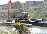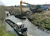 Since it was opened, the Ribble Link had been expensive to maintain. It suffered from flooding during the winter of 2003-2004, resulting in a lot of material being depositied in the channel, and scouring of some of the bywash weirs. The link was closed and Land and Water were employed to carry out dredging in March 2004. This was hampered by low water levels due to damage to the bywash weirs and by water supplies being limited by other work taking place on the Lancaster Canal. The whole of the link needed to be dredged, and further flooding took place while the work was in progress. The cost of the operation was £124,576.[43] The link was closed again during 2006, after voids appeared behind some of the lock structures. The work to fill the voids and to repair a lock bywash cost £360,000. Further dredging was required and cost £240,000. Some of this was achieved by conventional bucket dredging, where the material was removed and taken to landfill, but the use of 'cutter section' dredging was also trialled, after a licence was obtained from the Department for Environment, Food and Rural Affairs (DEFRA). This involved pumping the silt over the sea lock gate when the tide was going out so that it was carried into the Ribble, and following completion of the work, the link was re-opened on 6 April 2007. The effectiveness of cutter section dredging resulted in British Waterways applying for annual licences for the process. Sludge is brought into the lower section of the link by incoming tides,[44] and is a known problem on the Ribble. The cost of dredging to maintain the route to Preston Docks was one of the main reasons why they were closed in October 1981.[45]