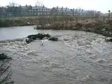 Flows on the Savick Brook vary considerably, from as little as 110 cubic feet per minute (50 L/s) up to 74,000 cubic feet per minute (35 m3/s). In order to accommodate these flows, weirs which are up to 100 feet (30 m) wide were required at the locks, and the bypass channels generally use the original course of the brook.[15] In order to allow fish to continue to move along the watercourse, fish passes would be built into the weirs. The Environment Agency raised concerns about water quality, but these were withdrawn in March 1999 after North West Water announced that they would soon be building a new interceptor sewer to run close to the Savick Brook, and the Trust agreed to make the channel slightly narrower, to improve flow speeds.[16] When originally conceived, the navigation would have had eight locks, numbered 1 to 8 from the Ribble upwards. Lock 2A was added, to ensure that the level of the pound above lock 2 did not compromise land drainage in the locality.[15] The locks were subsequently renumbered 1 to 9 from the Lancaster Canal downwards, in order to follow the convention used on the Glasson Dock branch. (Care should be taken when reading source documents on the construction, which use the old order).[17]