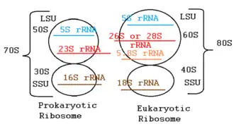eukaryotic cytosolic ribosomes (R. norvegicus)[18]: 65 ribosome subunit rRNAs r-proteins 80S 60S 28S (4718 nt) 49 5.8S (160 nt) 5S (120 nt) 40S 18S (1874 nt) 33