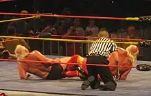 Flair then began teaming with Carlito after Flair said that Carlito had no heart.[82] Flair defeated Carlito in a match after which Carlito realized that Flair was right.[83] Flair and Carlito faced off against Lance Cade and Trevor Murdoch in a number one contender's match for the World Tag Team Championship but were defeated. The two teamed up on the WrestleMania 23 pre-show, and defeated the team of Chavo Guerrero and Gregory Helms. After weeks of conflict between Flair and Carlito,[84][85] the team split up when Carlito attacked Flair during a match on the April 30 episode of Raw.[86] At Judgment Day, Flair defeated Carlito with the figure four leglock.[87]