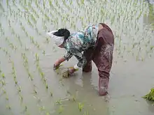 As rice farming becomes more mechanized, traditional wooden farm tools as well as older strains of rice are also preserved. Among the 1,600-plus varieties of rice grown in the delta, a unique variety is the "floating" rice — its several-foot-long stems keep it above rising floodwaters.[2][5] However, old rice varieties have their special place. According to an expert of Vietnamese rice-growing region: