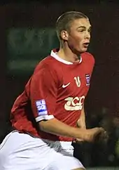Brodie was named as York's Players' Player of the Year for the season, as well as being awarded the Keith Walwyn Golden Boot, having scored 32 goals at that point.[99] York finished fifth in the Conference Premier,[100] and Brodie was the division's joint top scorer alongside Matt Tubbs with 26 goals.[76][101] He scored the winning goal on 89 minutes to give York a 1–0 home victory against Luton in the play-off semi-final first leg.[102] He played in the 1–0 away victory in the second leg, meaning York won the tie 2–0 on aggregate.[103] After the match, Brodie was hit by a coin, with the squad being forced into the back of a stand after missiles were thrown at them by a section of Luton fans.[104] He started in the 2010 Conference Premier play-off final at Wembley Stadium on 16 May 2010, in which York lost 3–1 to Oxford.[105] He finished 2009–10 with 51 appearances and 34 goals,[76] making him York's highest goalscorer in a season since Bottom scored 39 in 1954–55.[106] York entered negotiations over a new contract with Brodie after the end of the season.[107] At the Football Conference's Annual Presentation Dinner, he was named the Conference Premier Player of the Year and a member of the Team of the Year.[108]