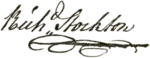 In 1777, all members of Congress and Washington's Continental Army were required to take the oath of allegiance to the United States. Stockton, as a prisoner of war and taken behind enemy lines, was also required to take the oath. He was called before the Board, took the oath, and was dismissed. Stockton did not turn in any protection papers, as was required if one signed Howe's proclamation and was given a pardon.[11] Because of the parole document Stockton signed with General Howe to gain his freedom that gave his word of honor not to meddle in the war, which was required to be given a parole, Stockton resigned from Congress. It took nearly two years to regain his health, according to Dr. Rush. In Princeton, a rumor was started by Mr. Cochran, a Tory, who claimed Stockton had taken General Howe's protection, which caused Stockton to be spoken against for a short time, but "Mr. Cochran's known quarrel with him makes it very doubtful to candid persons," Rev. John Witherspoon wrote in a letter to his son David.[12] "Common report, moreover, may be attributed to Judge Stockton some of the exploits of a distant cousin, Major Richard Stockton an obnoxious Tory, who did take Howe's protection and went over to the British until he was captured in Feb. 1777."[13] The major Richard Stockton referenced was, in fact, the first cousin of Richard "the Signer" Stockton, Major Richard Witham Stockton of Princeton, New Jersey, a commissioned officer in the British Army. Major Richard Witham Stockton remained loyal to the crown, and at the conclusion of hostilities, emigrated, along with members of his family and other United Empire Loyalist, to what would become New Brunswick, Canada.[14]