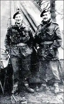 He was commissioned into the 2nd/4th Battalion of the King's Own Yorkshire Light Infantry (KOYLI). Following arctic warfare training in Iceland he returned to the UK as a lieutenant (having been promoted to that rank on 1 October 1942).[5] For a short while he was posted, at his request, as liaison officer to the 42nd Armoured Division then applied to join the Parachute Regiment to have a better chance at seeing action. He was accepted and after training was posted to the 7th (Light Infantry) Parachute Battalion, which formed part of the 5th Parachute Brigade of the 6th Airborne Division, commanded by Major General Richard Gale. On 6 June 1944, he participated in Operation Tonga during the D-Day landings.[6] He was among the first British soldiers to land in Normandy and the first Irishman.[1][7] His battalion parachuted after glider-borne forces had landed to capture the Pegasus Bridge near Caen.[6] During the operation he met Major John Howard on the bridge and was involved in helping to repulse counter-attacks by the German forces in the area. Five days after D-Day, while still in the bridge defence area, he was promoted to captain.[8][5] Todd later played Howard in the 1962 film The Longest Day, recreating these events.[9]