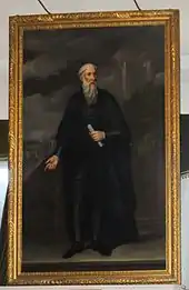His grave, with coat of arms and simple inscription, is close to the south side of the pulpitum steps, just where he wanted it. In 1730, just over 150 years after his death, the city council resolved to erect a monument to his memory. A Mr. Charles Easton was tasked with the same for a sum of £50 (equivalent to £336 in 2021[lower-alpha 5]).[8] The memorial in the south transept of the cathedral incorporates the bust mentioned above. The bust appears to have been given by Josiah Brooke the current owner of Satis house, for below the bust and above the inscription[lower-alpha 6] a bold statement testifies: "Archetypum hunc dedit IOS. BROOKE de SATIS Arm".