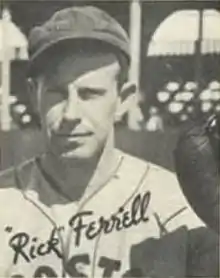 In 1934, the Red Sox signed Ferrell's brother Wes, forming a formidable battery for the next three and half seasons.[1] Rick ended the year with a .297 batting average and led the league's catchers in fielding percentage and in putouts and finished second in assists.[2] With Ferrell calling the pitches in 1935, his brother pitched to a 25–14 won–loss record,[4] and was runner-up to Hank Greenberg in voting for the 1935 American League Most Valuable Player Award.[18] Ferrell posted a .301 batting average for the year and led the league in baserunners caught stealing.[2]