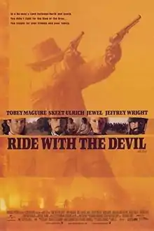 Ride with the Devil is a 1999 American Revisionist Western film[3] directed by Ang Lee and starring Tobey Maguire, Skeet Ulrich, Jeffrey Wright, and Jewel in her feature film debut. Based on the novel Woe to Live On, by Daniel Woodrell, the film, set during the American Civil War, follows a group of men who join the First Missouri Irregulars, also known as the Bushwhackers—guerrilla units loyal to pro-Confederacy units of the state—and their war against Northern Jayhawkers allied with the Union army. Simon Baker, Jonathan Rhys Meyers, Jonathan Brandis, Jim Caviezel, Mark Ruffalo, and Celia Weston are featured in supporting performances.
