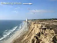 Ridge lift (or slope lift) is created when a wind strikes an obstacle, usually a mountain ridge or cliff, that is large and steep enough to deflect the wind upward.