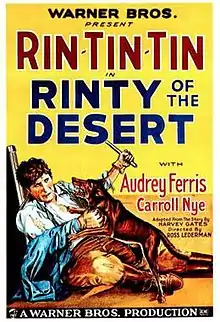 Rinty of the Desert is a 1928 American silent drama film directed by D. Ross Lederman.[2] The film was released with a Vitaphone soundtrack with a synchronised musical score and sound effects. This film is presumed to be lost.[3][4][5] According to Warner Bros records, the film earned $164,000 domestically and $57,000 foreign.[1]
