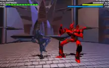 In two player versus mode, one player controls the ECO35-2 droid by default, while the other chooses between one of the five droids seen in single player mode (a special cheat code can enable the Supervisor as well). Players then battle out against each other in two to seven rounds. In the arcade version, the players select eighteen characters but each six characters has a different colour palette.