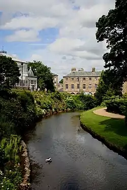 The river rises just west of Buxton, on Axe Edge Moor. Part of the flow passes underground through Poole's Cavern before rising at Wye Head,[3] and flowing through the Pavilion Gardens in Buxton. It then flows east through the dales of the Wye Valley, along a route roughly followed by the A6 road. It enters the Peak District, flows just south of Tideswell, then through Ashford in the Water and Bakewell, and south of Haddon Hall, before meeting the River Derwent at Rowsley.