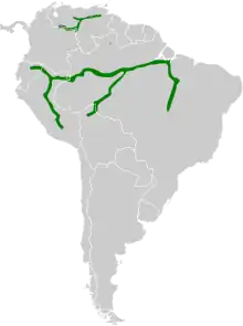 Its range consists of several Amazon Basin river-corridors and the Orinoco River drainage river corridors, and extending into neighbor countries, or a country-river border. Its natural habitat is subtropical or tropical moist shrubland located along these corridors.