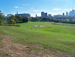 The eastern side of the park was also used as a landfill in the 1920s. A walk along Broadview Avenue shows the evidence of this in the form of green exhaust pipes to vent the methane gas from the former dump beneath the park.[6]
