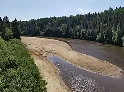 The Sault aux Cochons River has its source in Breault Lake, 9 km (5.6 mi) south of Pipmuacan Reservoir. It then flows in a southwesterly direction and crosses Sault aux Cochons Lake halfway through.[1] It flows over a length of 159 km (99 mi) according to the Commission de toponymie du Québec or of 128 km (80 mi) according to the Organisme des basins versants de la Haute-Côte-Nord to flow into the St. Lawrence River at Forestville.[1][2] The fifteen kilometer downstream of Sault aux Cochons Lake is encased in a canyon.[3] The area of its watershed is 1,946 km2 (751 sq mi).[4]