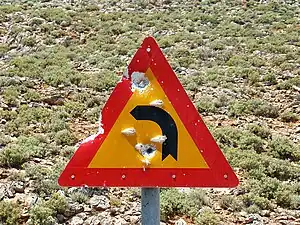 The first road signage on Greek roads with contemporary signs was made in 1924 by ELPA (Elliniki Leschi Periigiseon kai Aftokinitou, lit. translated: Hellenic Club of Tours and Car),[3] which took over the road network's signage until 1957, when it was taken over by the state.[4] The signs were subject to the provisions of the Geneva Protocol on Road Signs and Signals.