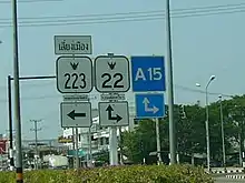 Road signs in Thailand are standardized road signs similar to those used in other nations but much of it resembles road signage systems used in South American countries with certain differences, such as using a blue circle instead of a red-bordered white circle to indicate mandatory actions.[1] Until the early 1980s, Thailand closely followed American, European, Australian, and Japanese practices in road sign design, with diamond-shaped warning signs and circular restrictive signs to regulate traffic. The Department of Railway maintains a standard on the typeface used in the sign, with custom made type for Thai text, and a small derivation of FHWA Series fonts ("Highway Gothic") typeface, which is used on American road signage, for Latin text. [2]