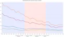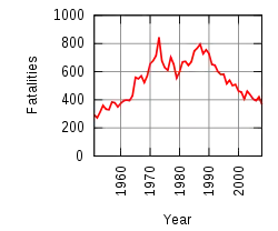 Road toll statistics are available from as far back as 1921, when records began.[3] A peak was reached with 843 deaths in 1973.[4] Here are some figures from the last few years (dashes indicate figures not published or unavailable).[5][6]