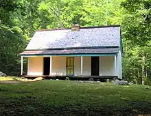 Of all the buildings on Reagan's farm, only his cabin and mill remain today. Due to its sawboard paneling and coat of paint, Reagan's cabin stands out among historical structures in the Smokies today. The cabin's design is known as a "saddlebag" design, which involves two cabins constructed around a single chimney.[13] A kitchen area was added later.[14]